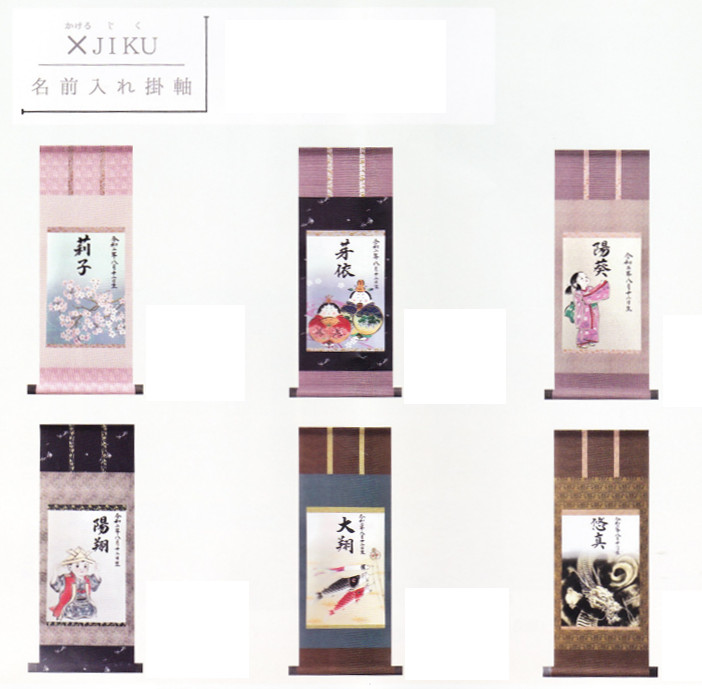 ひな人形の9本の掛軸と名前入れ掛軸6本をご紹介します。