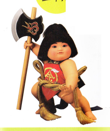 別名を金時と呼びます。童話でおなじみの熊と相撲をとった力自慢の童子。平安時代の剛勇、坂田金時の少年時代だといわれています。成人して都に上った公時が、源頼光の四天王の一人となって大活躍する説話が浄瑠璃や歌舞伎で脚色され、子どもたちの英雄となりました。