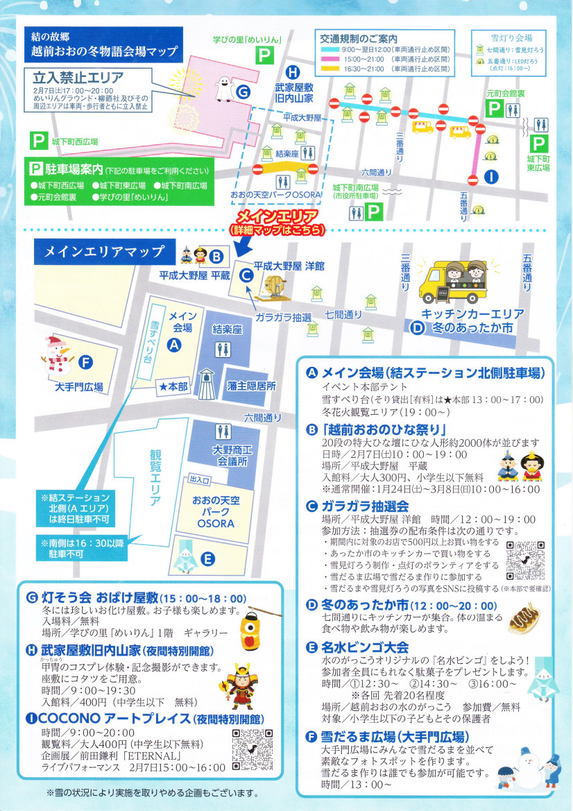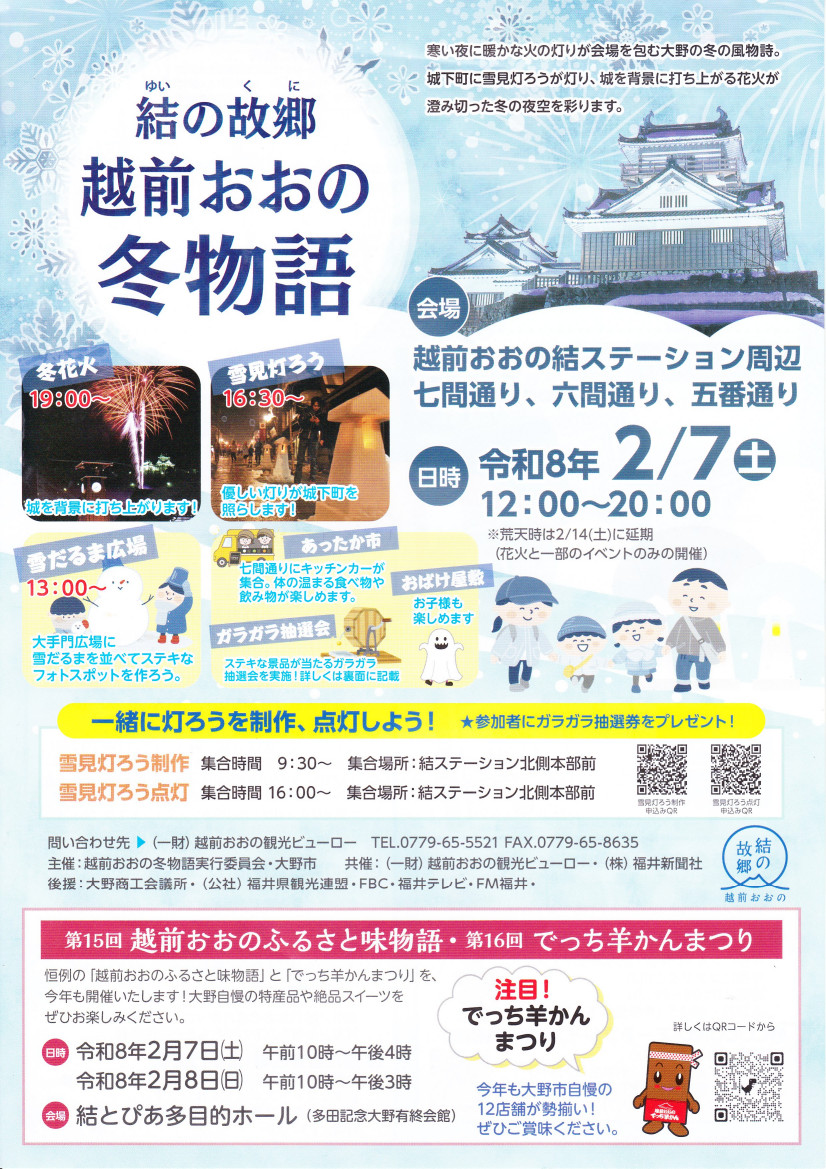 大雪でなければ、2月7日には越前おおの結ステーション周辺、七間通り、六間通り、五番通りにて「越前おおの冬物語」(12時~20時)、2月7日と8日には結とぴあ多目的ホールにて「越前おおのふるさと味物語」、「でっち羊かんまつり」(7日は10時~16時、8日は10時~15時)が開催されます。